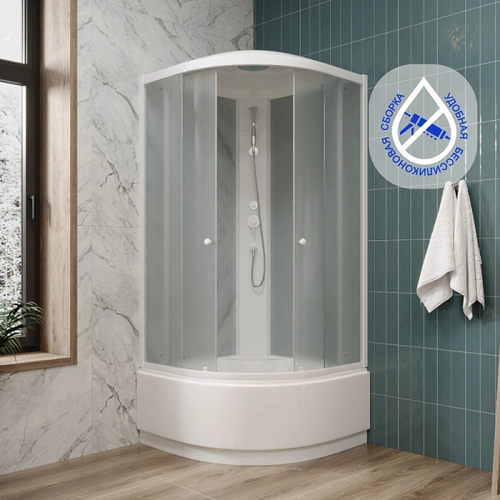 Высокий поддон (42 см), ABS-пластик, белый, полукруглый. Противоскользящее покрытие поддона предупреждает падения.